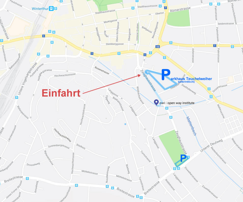 Parkieren beim owi - open way institute - Das Parkhaus Teuchelweiher ist nur 250m von uns entfernt.